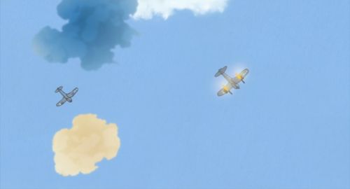 (right) At such a distance, it's hard to choose between a Kawanishi N1K-J Shiden or a Mitsubishi J2M Raiden; as Entaro (Suzu's father-in-law) is speaking of the 2,000 HP engine, it couldn't be the Mitsubishi J2M Raiden powered by a Mitsubishi Kasei providing only 1,800 HP.