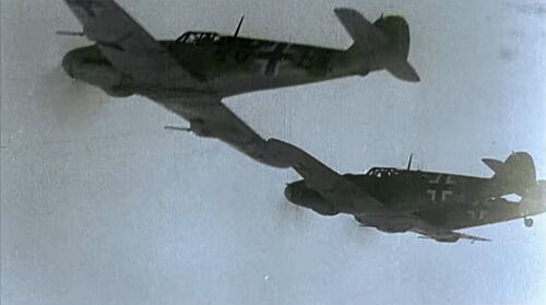 Messerschmitt Bf 109 F4/R1 5 RG+BL in the foreground.