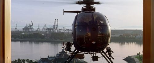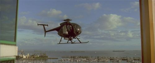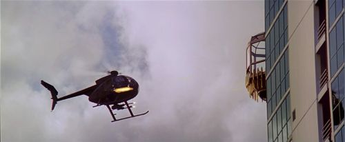This helicopter tries to kill Slater as he rides down a glass elevator at the hotel. It unintentionally assists him and winds up killing several several mobsters when he ducks at a crucial moment.