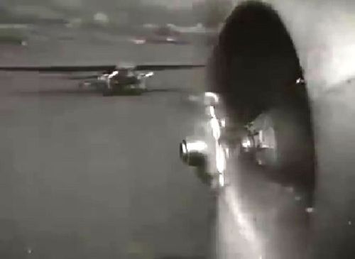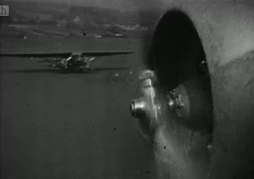 Just before the landing, a view from another airplane. On the ground an unidentified aircraft with engines mounted on stub-wings, perhaps a Farman F.222/1. This shot of no more two seconds is probably filmed at Le Bourget Airport.