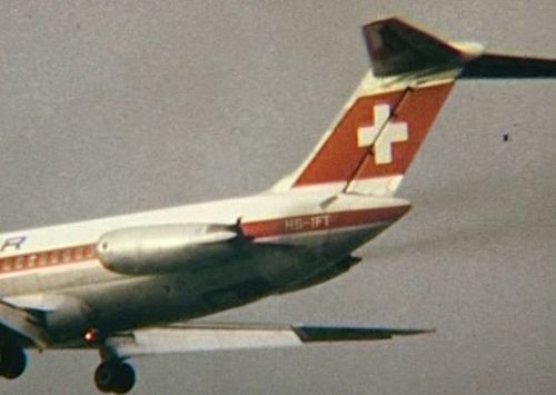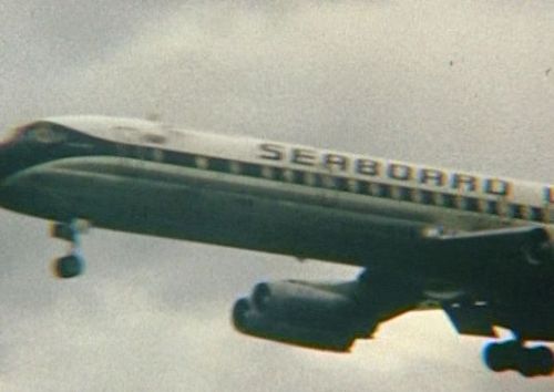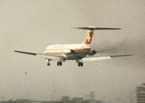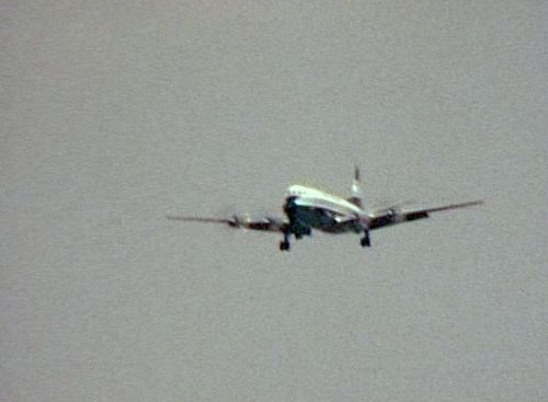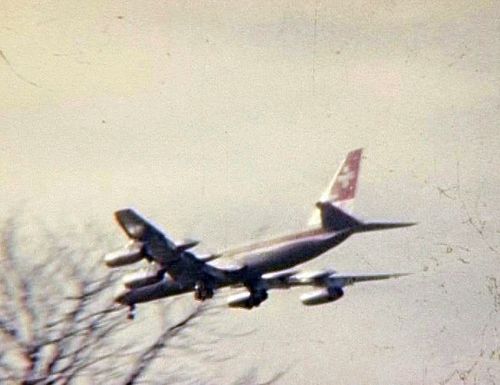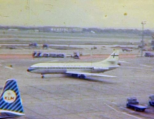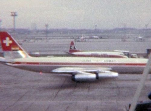 On approach in the sky of Heathrow. Must be either HB-ICA, c/n 30-10-7 Bern or HB-ICE, c/n 30-10-14 Vaud of Swissair on lease to Ghana Airways in 1964. See the Ghanaese flag on the tail fin.