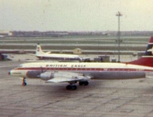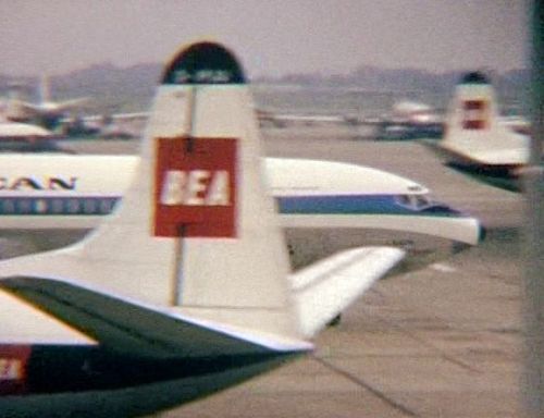 BEA's Vickers 800 Viscount behind, with unidentified British Eagle's Britannia or 707 in the background beside another unidentified quadrijet to the right.