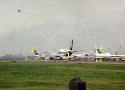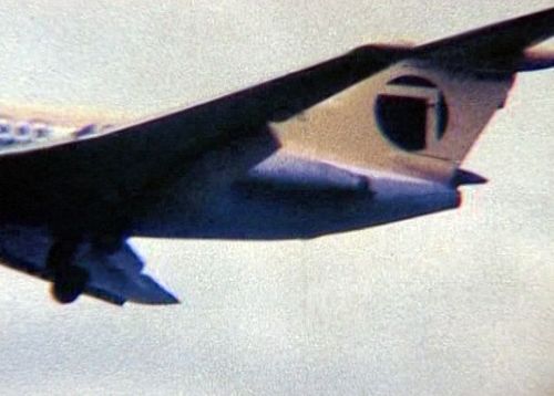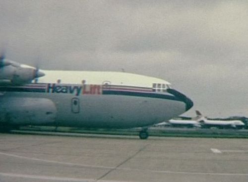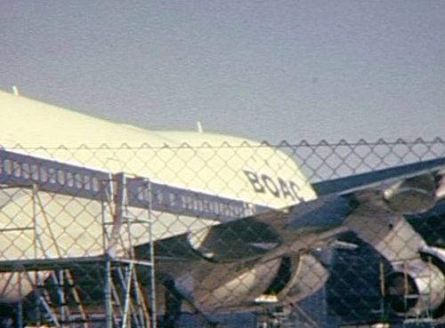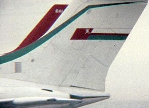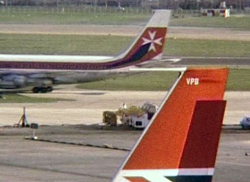Tail fin of Vickers 951 Vanguard registered G-APEI, c/n 712 in the foreground. Delivered to BEA on July 1961. Transfered to British Airways on April 1974. Sold to Merpati Nusantara Airlines on March 1975 as PK-MVD.IMPDb: Frequently Seen Aircraft (Civil Fixed-Wing).