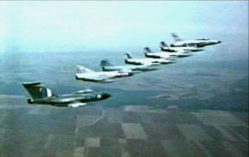 From foreground to background, Gloster Javelin, Mirage III, four F-104s and a F-105 in the last position.