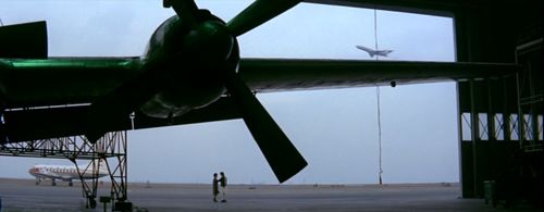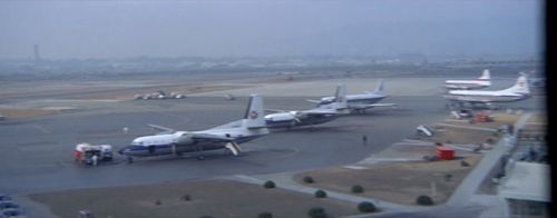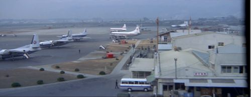 Wing and outermost engine of an ANA Viscount can be seen in the ANA hangar. A Convair 240 of Japan Domestic Airlines (a predecessor of Japan Air System, which has since merged with Japan Airlines) can be seen in the background, as well as a 727 taking off towards the right.