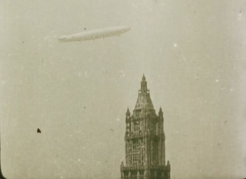Airship in the background of the Woolworth Building, Lower Manhattan in New York City, United States.