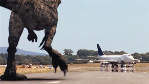 This Boeing 747 is attacked by a dinosaur. The plane is strong enough to survive the attack but the crew are stranded inside and underneath it. Aircraft is G-BDXJ (serial 21831) a former British Airways aircraft now based at Dunsfold Aerodrome.