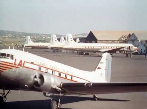 In the background, 3x Douglas DC-6B and tail fin of 1x Convair 240-2 of LAI, far background behind a hangar is a Douglas DC-6 tail fin of Alitalia –Aerolinee Italiane Internazionali.