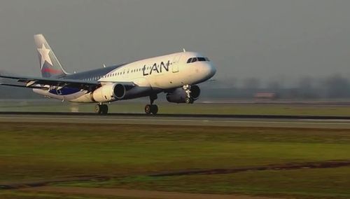 The LAN Airlines Airbus A320 is seen landing, supposedly at an airport in Rome. A LAN A320 would only be seen in South America.