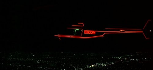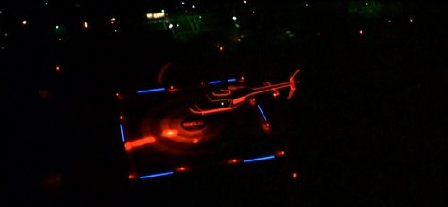 The Encom company helicopter. The neon effect was achieved by shining low intensity light on reflective tape stuck onto it.