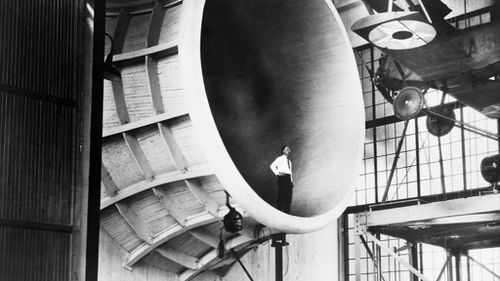 A Sperry Messenger mounted for testing in Langley's propeller research tunnel in 1927.