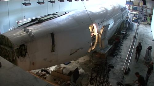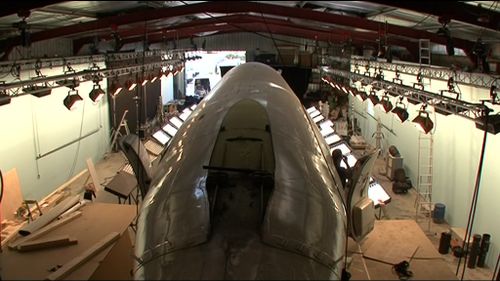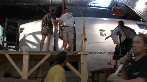 Production used a damaged airframe Boeing 737-200 (last registration as F-). The extra on the DVD explain how the crew need to secure lights and to provide all facilities to actors. Here are some stills :