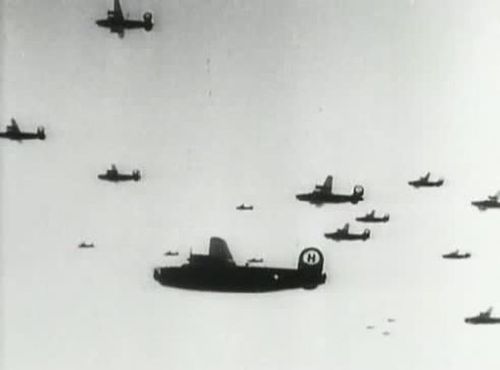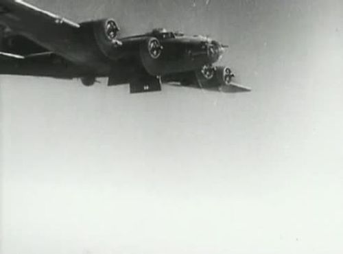 Bomb bay of a Martin B-26 Marauder. Front one first, looking backwards. (bottom right) Note how the last bomb gone is swinging.
