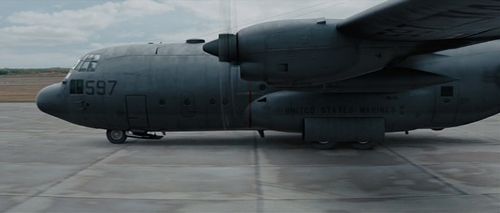 Modex OH-597 does not match any actual aircraft. Markings identify it as a USMC aircraft, which would make it a KC-130T, except there are no hose pods on the wing. Also goes past Canadian Armed Forces CF-188 Hornets. Most likely, considering the action sequence, a CGI aircraft.