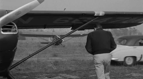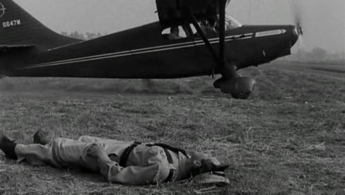 Reg. N8229K Universal Stinson 108-1 c/n 108-1229 seen during the final takeoff and flight and landing with propeller stopped (action already seen in theaters in 1953).
