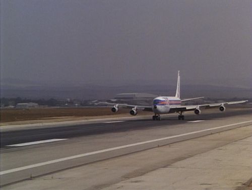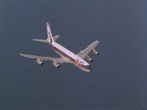 Registration N778PA, c/n 17903/108 built in 1960. Flew for several airlines, including Olympic Airways, Aer Lingus, Saudia, Turkish Airlines, and Pan American World Airways. Last operator was MAOF Airlines, an Israeli charter company, who retired the aircraft in December 1984. For filming, the aircraft retained the MOAF livery but its titles were repainted as the fictional American Travelways Airlines. Same aircraft in other works at IMPDb: Frequently Seen Aircraft.