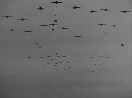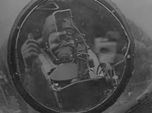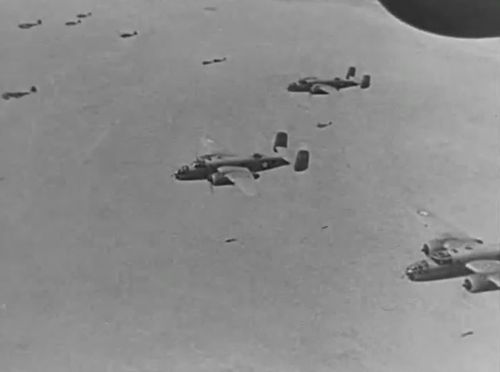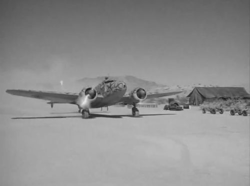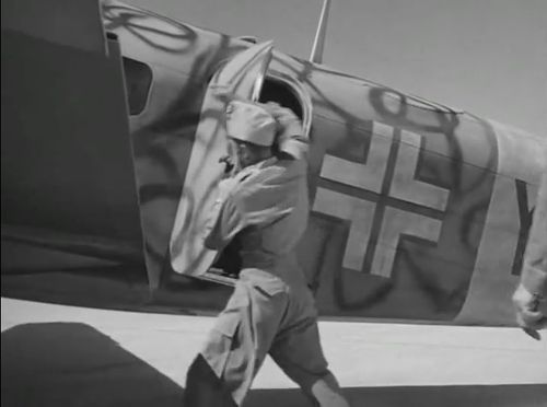 The attack occured in Normandy by a deep blue sky weather and was done by two Spitfires ... but first we see a torpedo bomber (!) with a cloudy background.