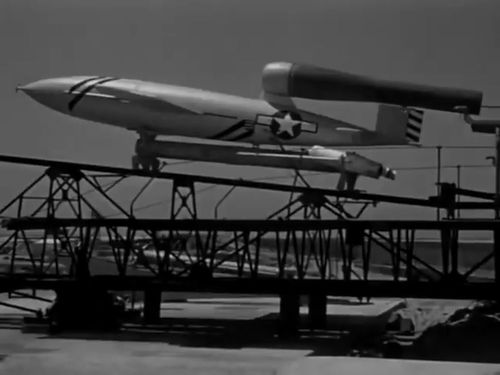 Despite we see a Lockheed P-80 Shooting Star taking off, the missile is chased by a prop-driven aircraft ...