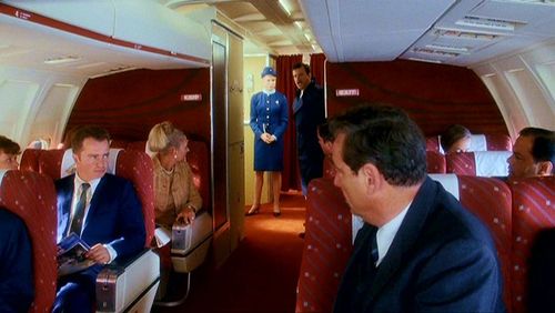During the flight to Italy where he is to begin filming The Pink Panther, Sellers creates the character of Inspector Clouseau. Stock footage of this BEA-British European Airways plane (registration G-ARPO) is used to show the take-off and the rest of the scene takes place in a plane interior set.