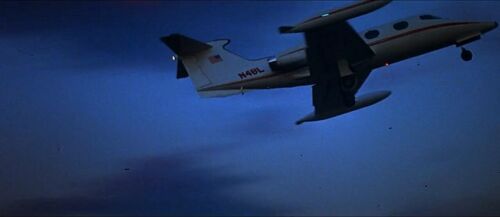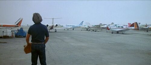 Left to right: Piper PA-31 with orange cheatline; Learjet 35A N1210A facing away from the camera; another Piper PA-31 with blue cheatline; Cessna 172 Skyhawk with brown cheatline; Mooney M20 with orange and brown cheatline.