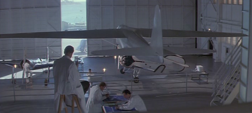 Inside Howard Hughes hanger. We guess the Hughes H-1 Racer on the ground, at left.