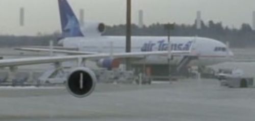 Air Transat TriStar in the background. All external airport scenes were filmed at Aéroport International Montréal–Mirabel (YMX/CYMX) in Canada.