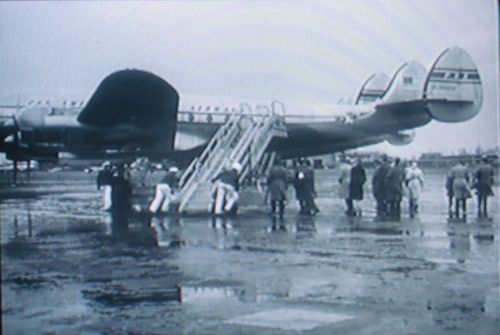 From left to right, a DC-4, a DC-6, another DC-4, and in the background a batch of Douglas DC-3, and a Lockheed Constellation.