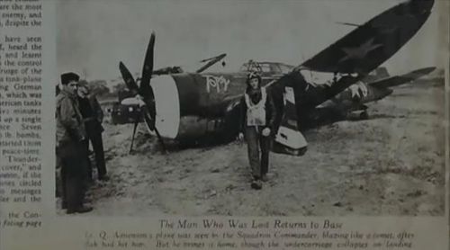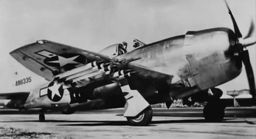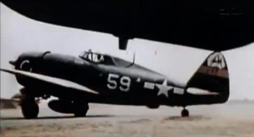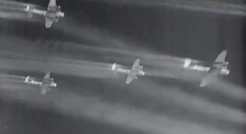 In the center, a P-47 or a A-36 Apache is firing HVAR (High Velocity Air Rocket) and the two fumes reveal its position, slighty at the right of his leader.