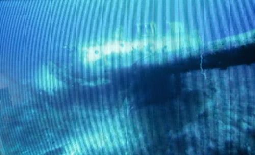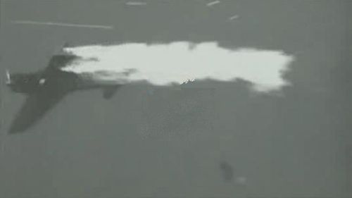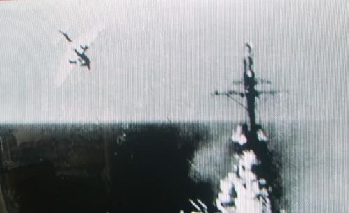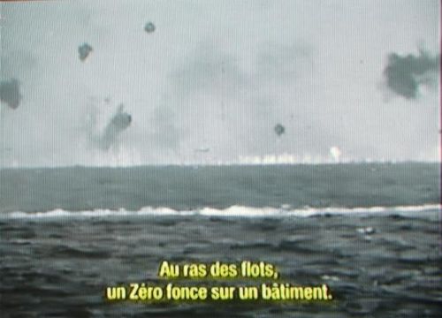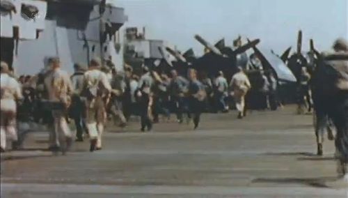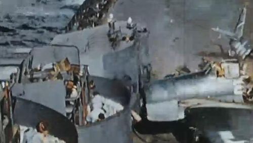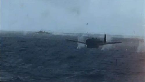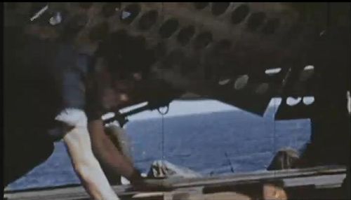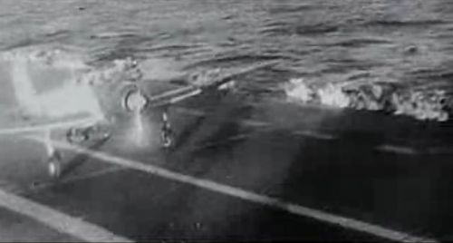 Picture to illustrate the result of the kamikaze attack which hit the Yorktown. The wing of a unspecified aircraft is seen on the left.