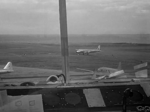 C-54 taxiing in the background. Closer to the camera but cut off by the ATC panel is a Curtiss C-46 Commando. At far left is the tail of an Ilyushin Il-12 with the red star of the Soviet Air Forces.