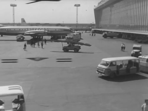 Ilyushin Il-62 on flight above the apron. Note the Tupolev Tu-104 of Aeroflot surrounded by 4x Ilyushin Il-18.