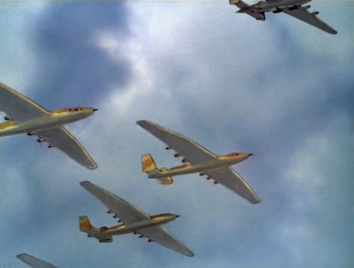 Like a first draft of the future Convair B-36 (which genesis started only a handful months before the movie). Indeed Convair started studies of its Model 36 a twin tail configuration.