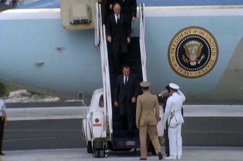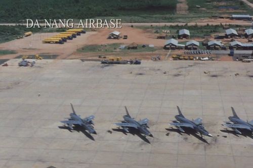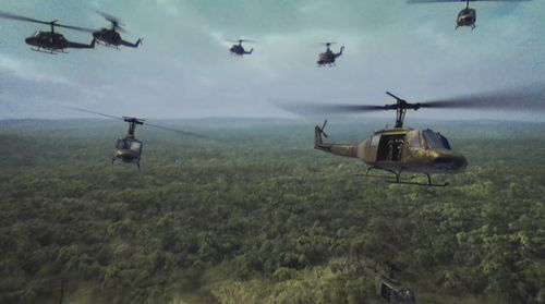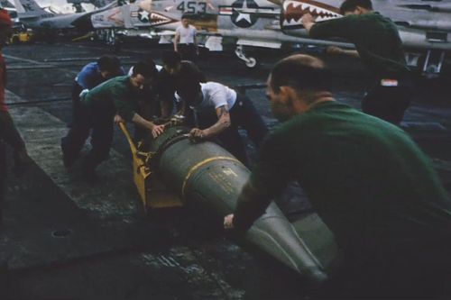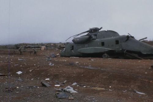 During "Operation Frequent Wind" in 1975, U.S. Navy personnel aboard an USS aircraft carrier push a Vietnam Air Force UH-1 helicopter into the sea off the coast of Vietnam in order to make room for more evacuation flights from Saigon.