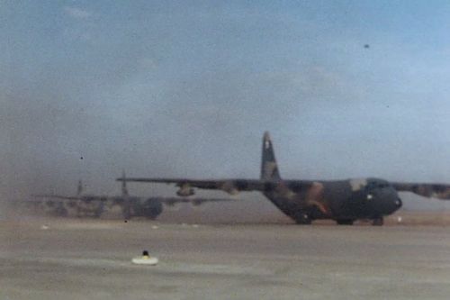 Kaman H-43 helicopter on the far left of the ramp, near the yellow fuel trucks.
