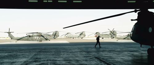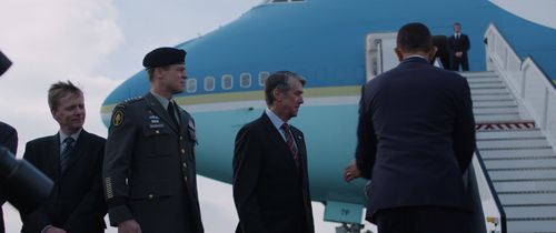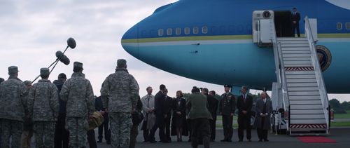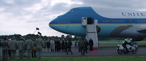 Dunsfold Aerodrome's famous 747 was digitally reskinned as Air Force One for this scene, though its "7P" wheel well mark can still be seen.