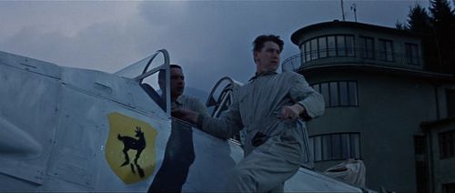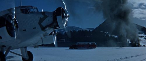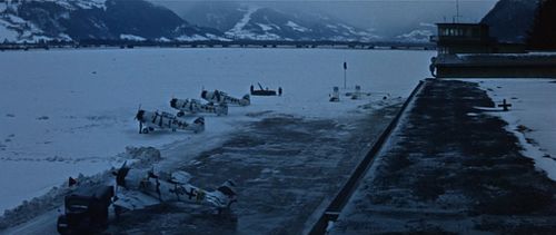 "German" fighter planes seen at Oberhausen Airfield (in fact, loaned Austrian Air Force trainers). Smith cripples them by running into them one at a time with the bus so they can't take off and follow the Junkers.