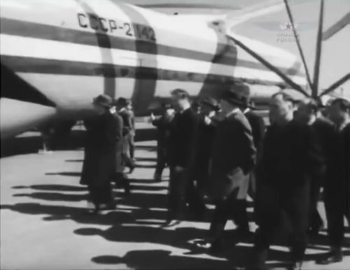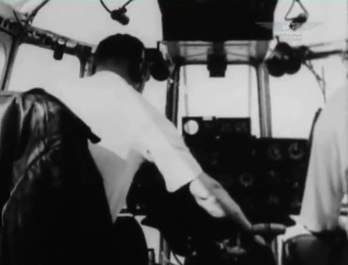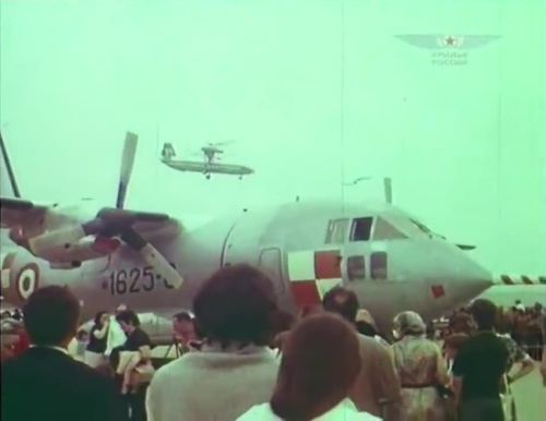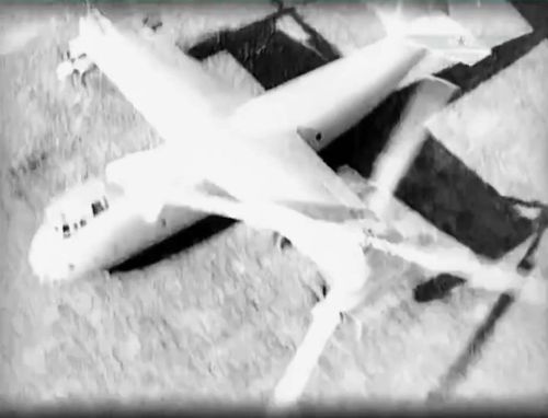 Demonstration flight (and landing !) during the Tushino Air Show, 1948. Note the (unidentified) observation balloon in the distance.