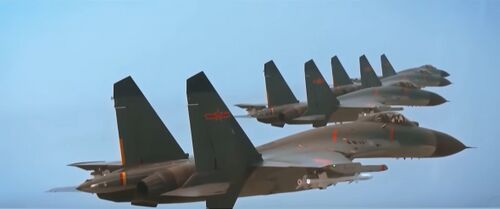 Counterclockwise from bottom: Boeing 737 of Shandong Airlines, Boeing 737 of Air China, another 737 of Shandong in a special livery (probably B-5119), followed by 4 more Air China 737s.